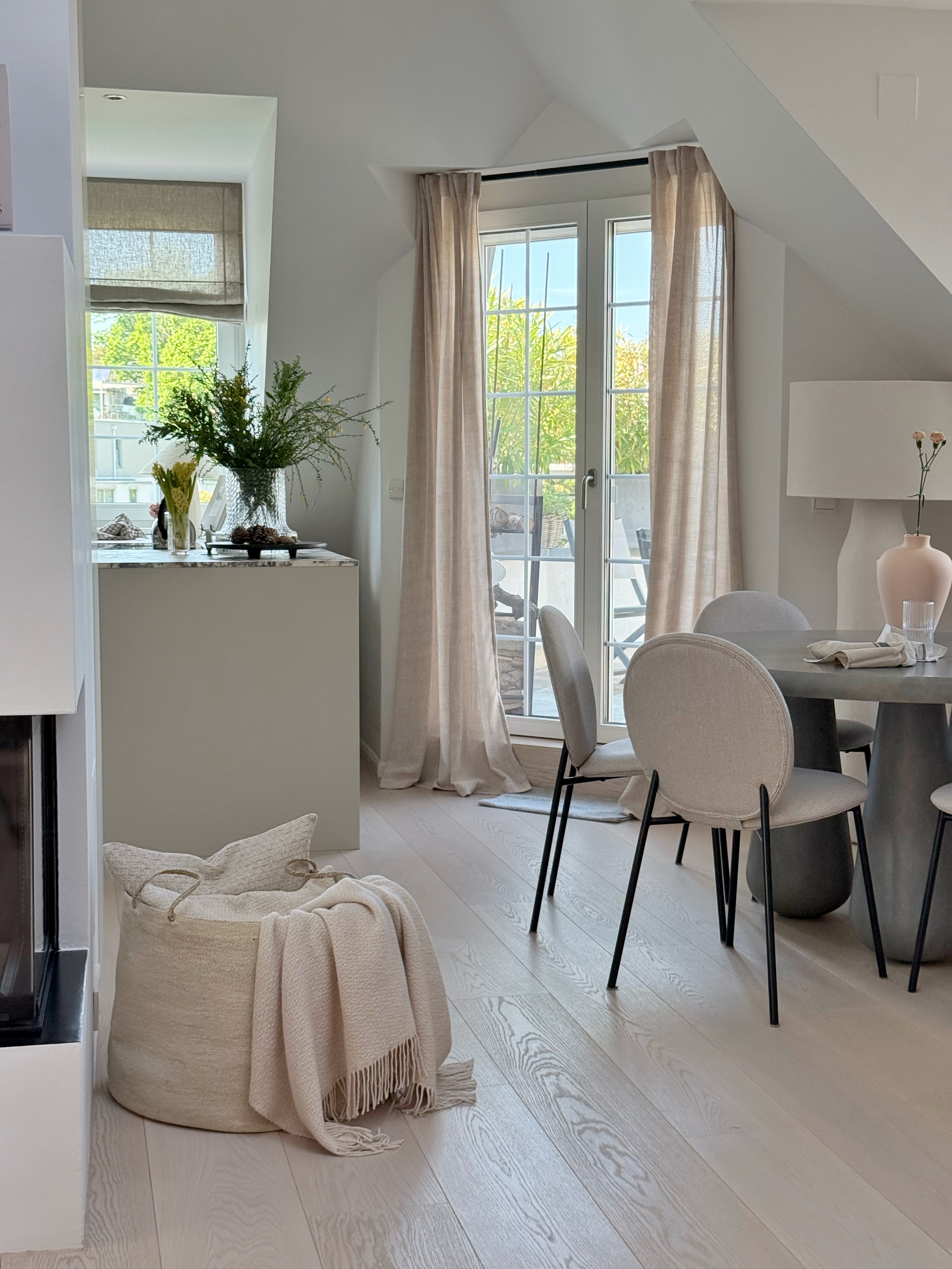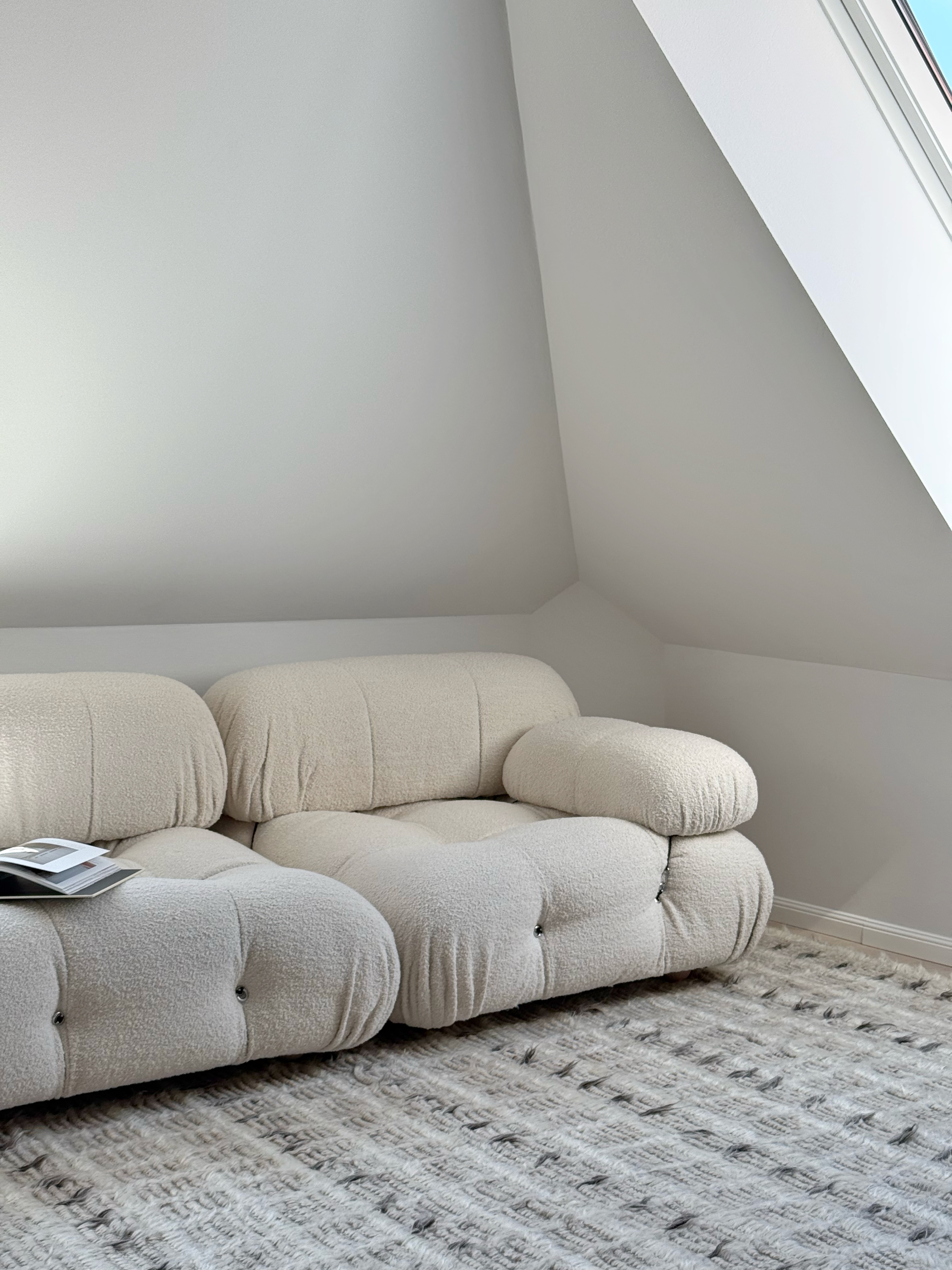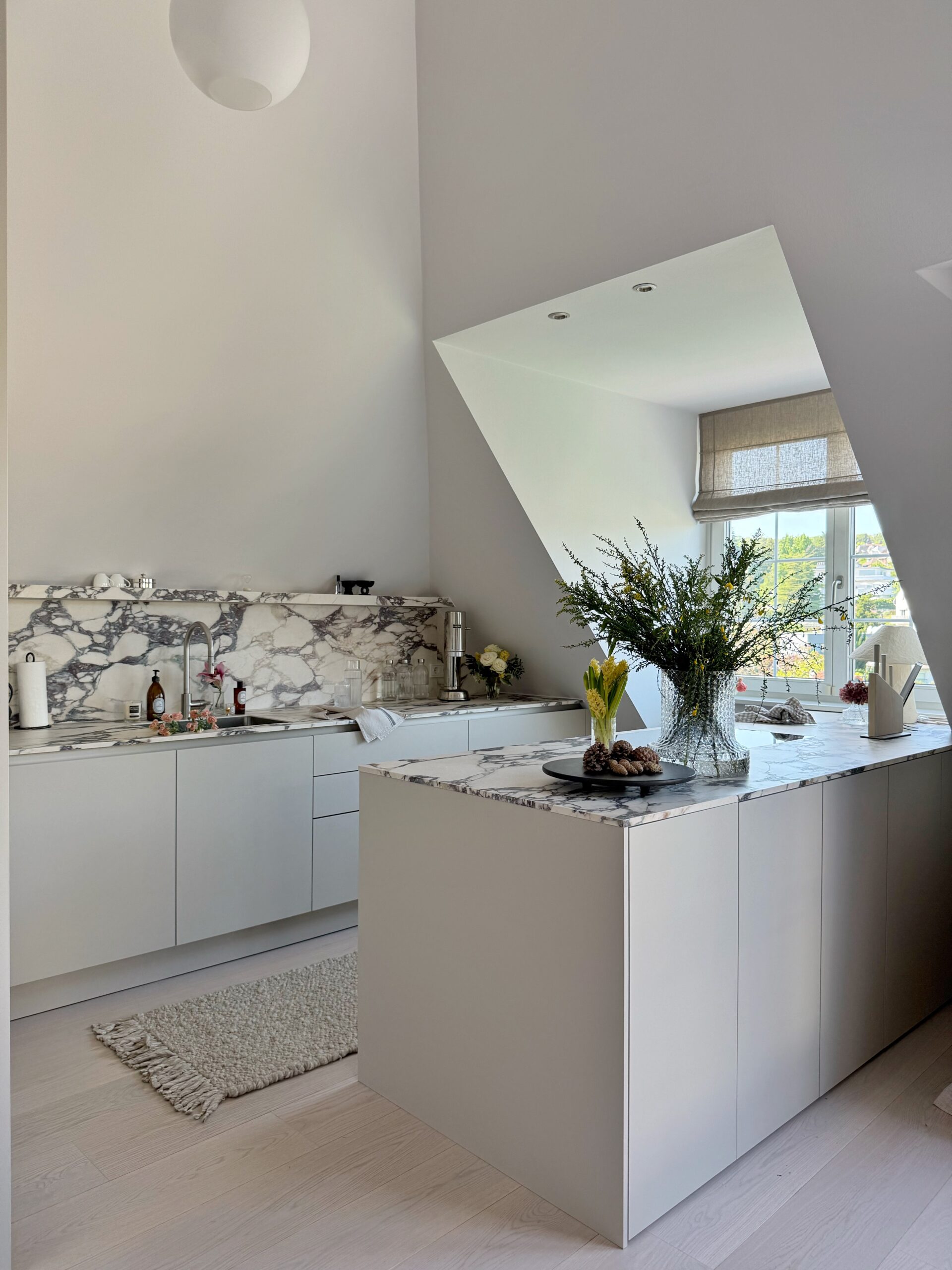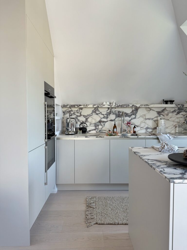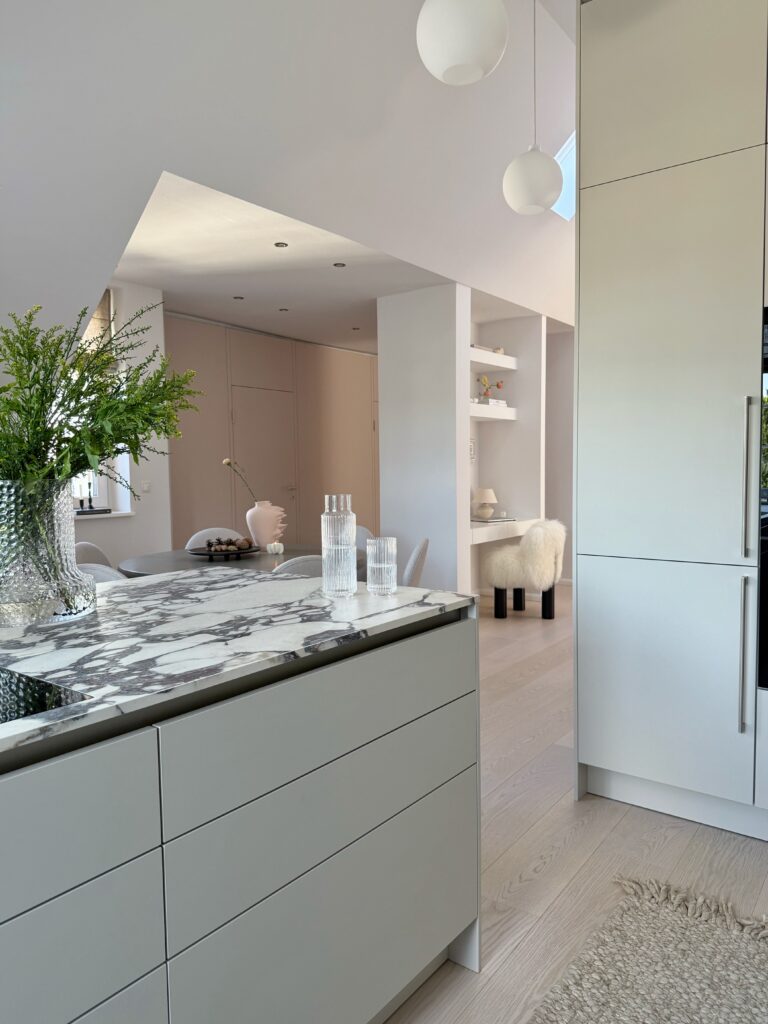 Hectic jobs lead to these clients longing for a calming, relaxing, and minimalistic apartment in neutral colors with some design elements, and an overall elegant appearance. By changing the floors into white soaped oak, we created a beautiful, bright and calm look. A kitchen in neutrals and a Calcatta Viola stone brought in interesting texture while underlining the overall elegant appearance. Design elements such as the Camaleonda from B&B Italia and custom made rugs were included to keep the minimalistic style but make it interesting.