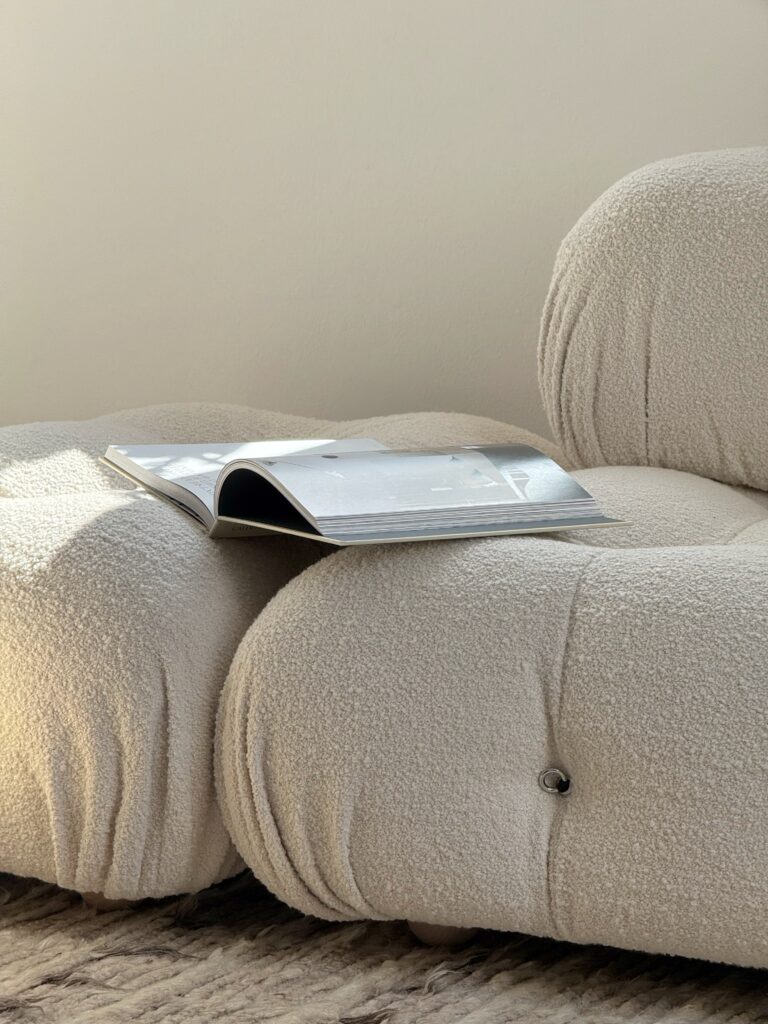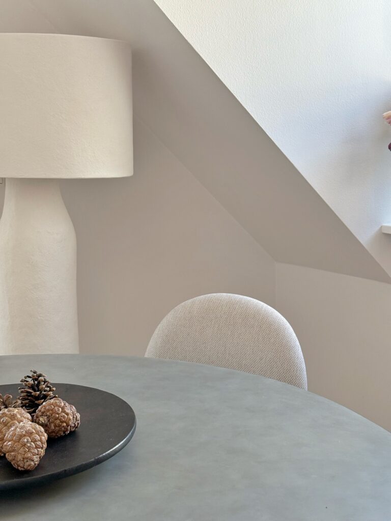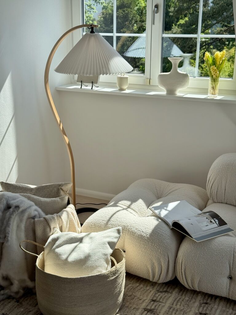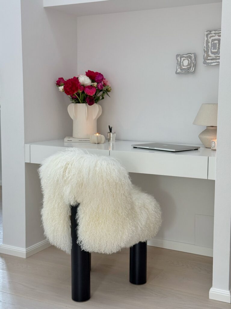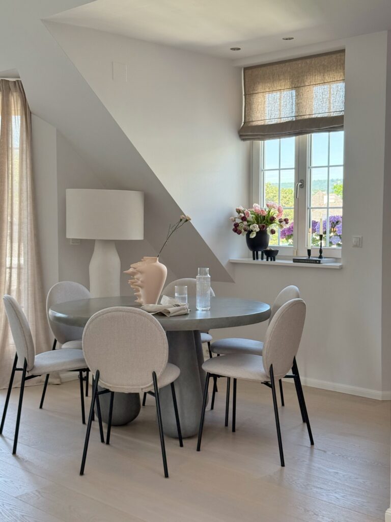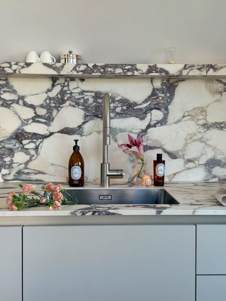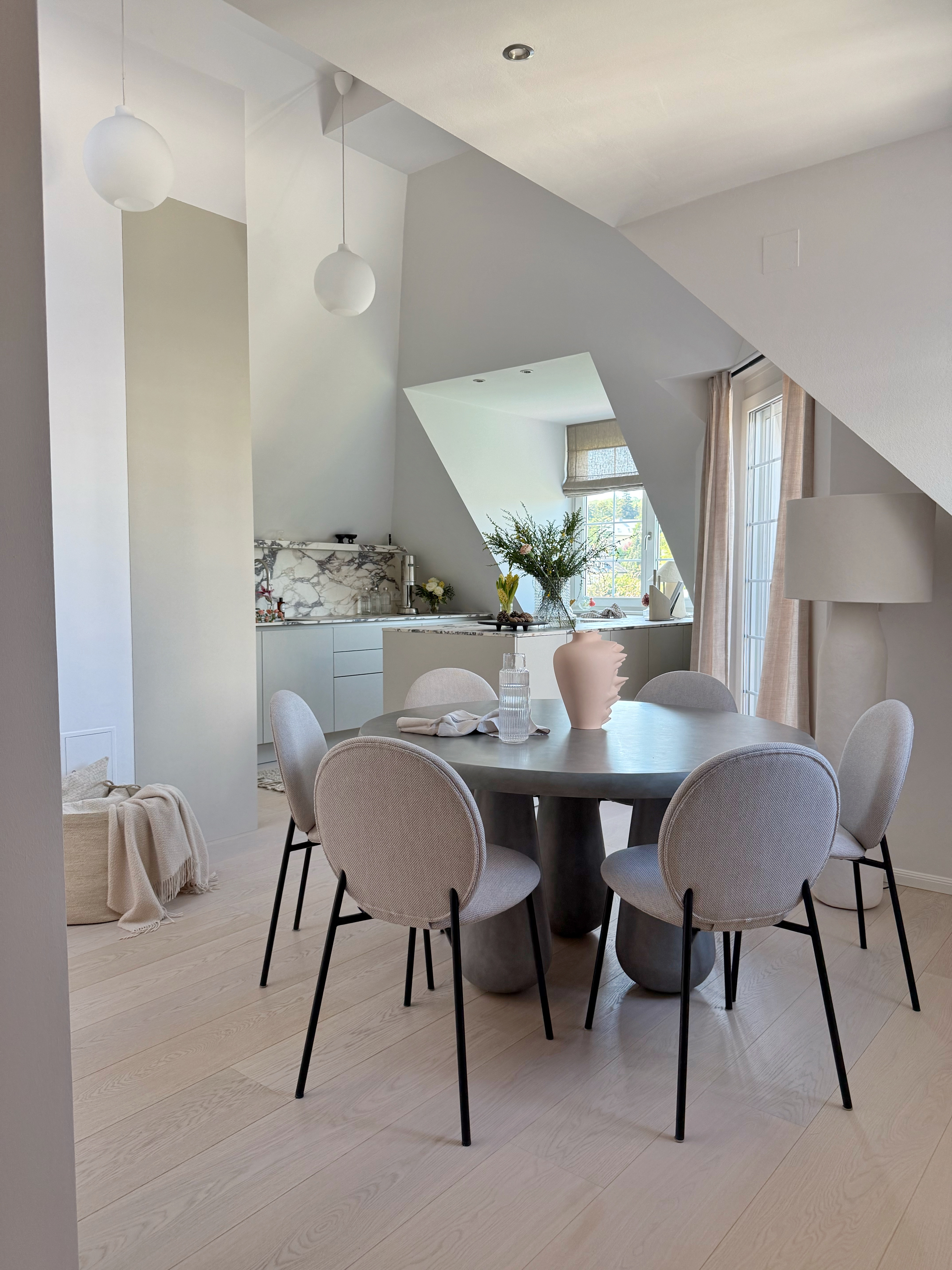 Hectic jobs lead to these clients longing for a calming, relaxing, and minimalistic apartment in neutral colors with some design elements, and an overall elegant appearance. By changing the floors into white soaped oak, we created a beautiful, bright and calm look. A kitchen in neutrals and a Calcatta Viola stone brought in interesting texture while underlining the overall elegant appearance. Design elements such as the Camaleonda from B&B Italia and custom made rugs were included to keep the minimalistic style but make it interesting.