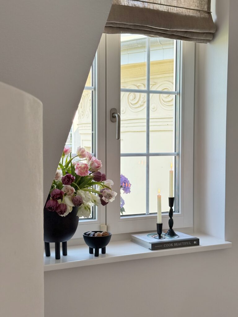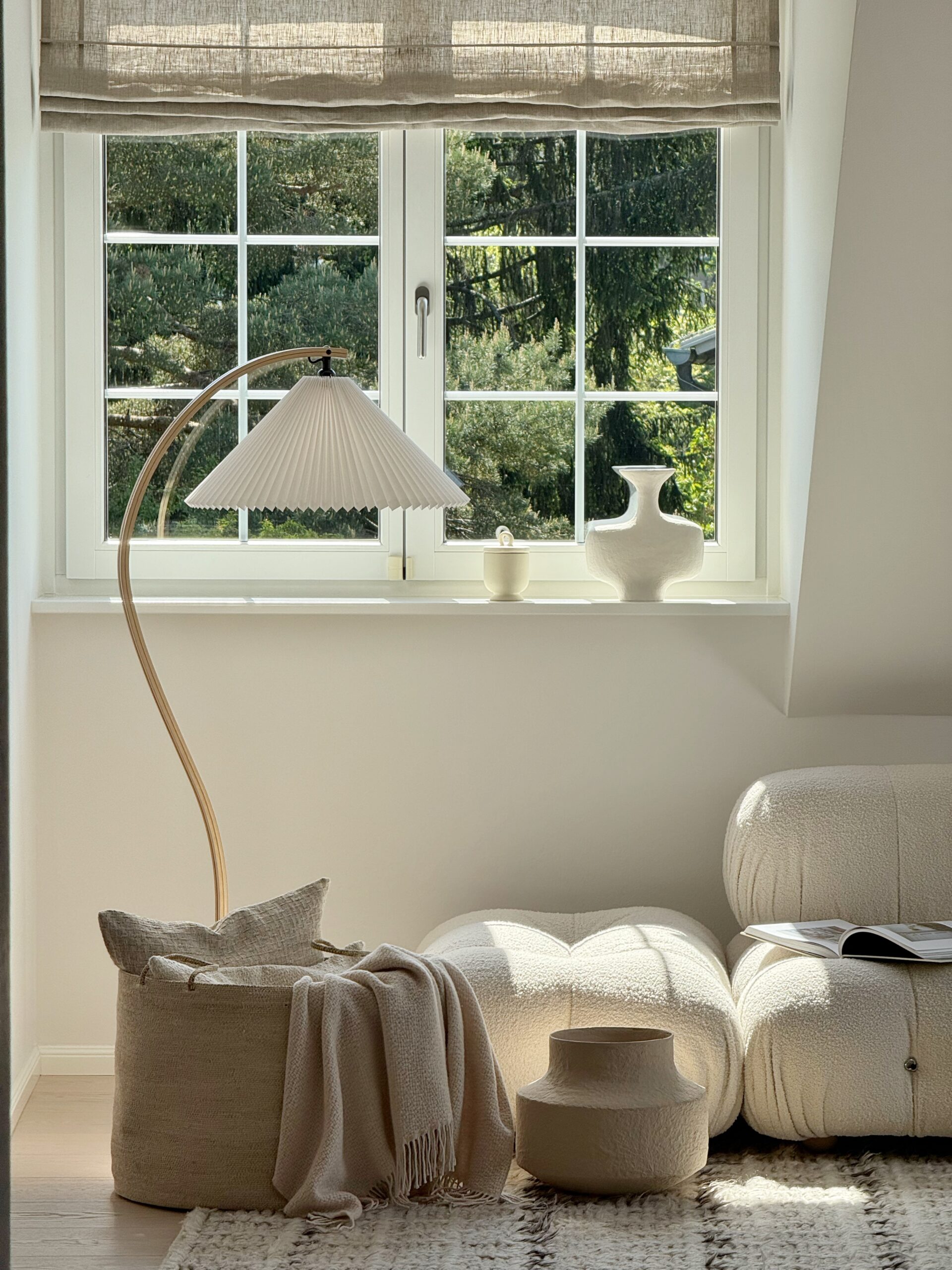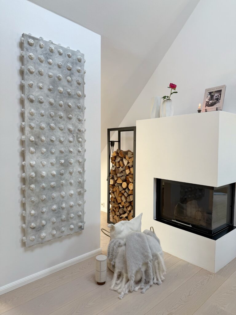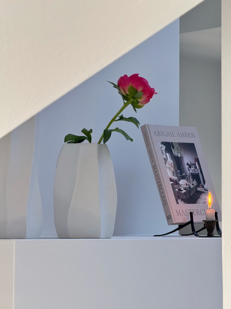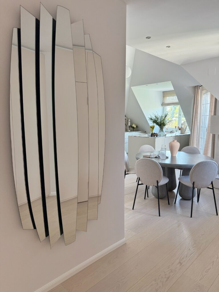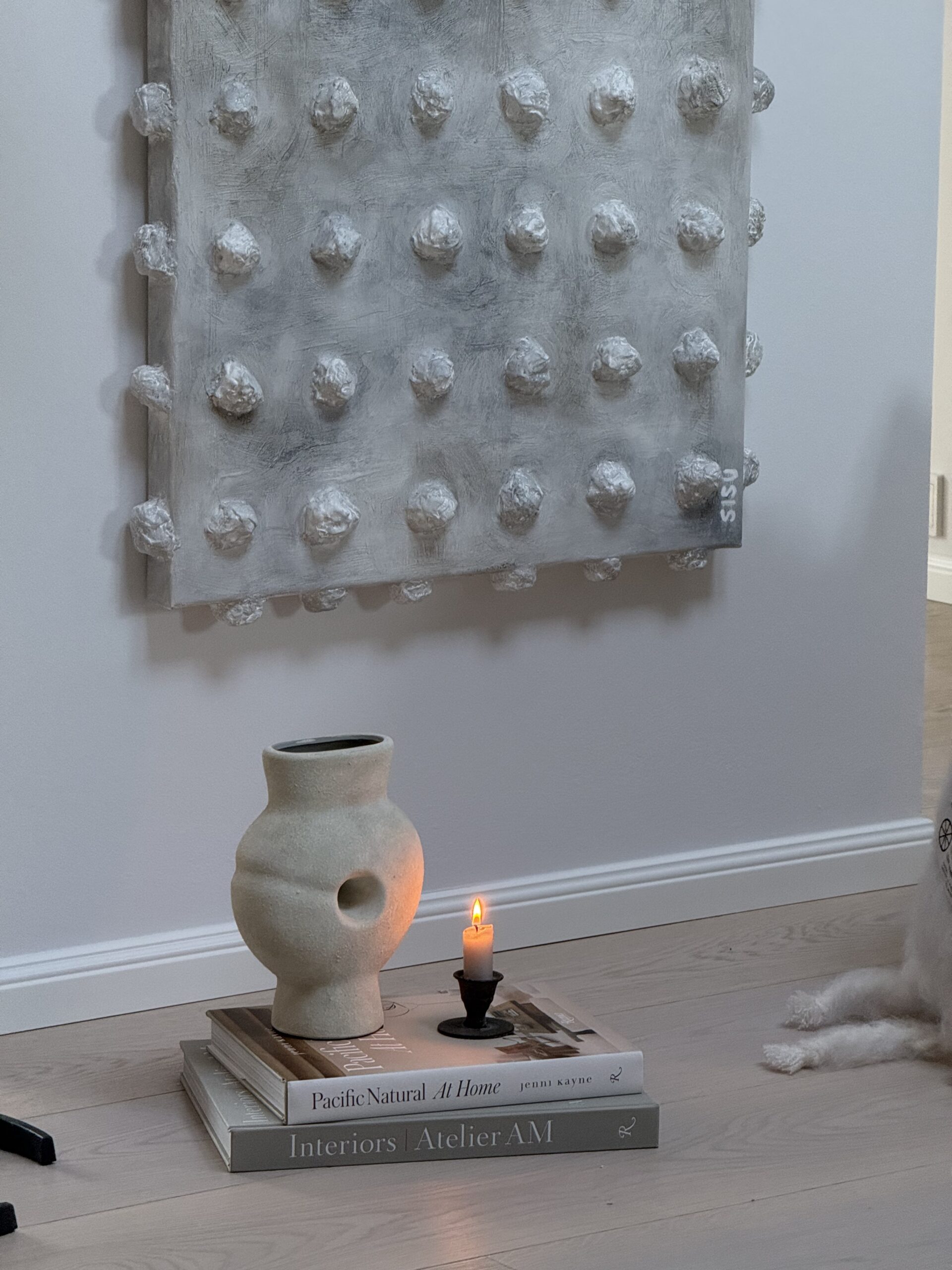 Hectic jobs lead to these clients longing for a calming, relaxing, and minimalistic apartment in neutral colors with some design elements, and an overall elegant appearance. By changing the floors into white soaped oak, we created a beautiful, bright and calm look. A kitchen in neutrals and a Calcatta Viola stone brought in interesting texture while underlining the overall elegant appearance. Design elements such as the Camaleonda from B&B Italia and custom made rugs were included to keep the minimalistic style but make it interesting.
